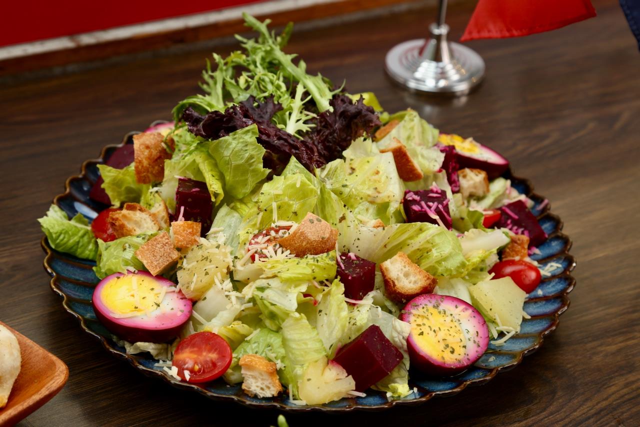 在賓夕凡尼亞州的日常飲食中,甜菜醃蛋原本是一種透過醃漬方式來延長食材保存時間的做法。將煮熟的雞蛋浸泡在醋與甜菜汁中,不只是為了風味或顏色,而是源自過去沒有冷藏設備時的生活經驗。那層紅紫色,是料理在時間中留下來的痕跡。ABV 將這樣的做法轉化為 甜菜醃蛋沙拉(Amish Beet Pickled Egg Salad),以沙拉形式呈現,保留酸甜風味與鮮明色澤,讓這道原本常見於家庭聚會的小食,自然融入餐桌。
