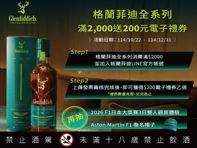 格蘭菲迪更將熱潮擴展至全台指定合作通路,10/22至12/31綁定官方LINE帳號並購買格蘭菲迪全系列商品滿NT$2,000,即可獲得NT$200電子禮券(數量有限,兌完為止);完成發票登錄者,更有機會抽中「Aston Martin F1聯名帽子」,以及終極大獎「2026 F1日本大獎賽3日雙人觀賞體驗」。格蘭菲迪邀請全台消費者一同沉浸於速度與品味交織的盛宴,讓每一次舉杯,都是邁向非凡旅程的起點。