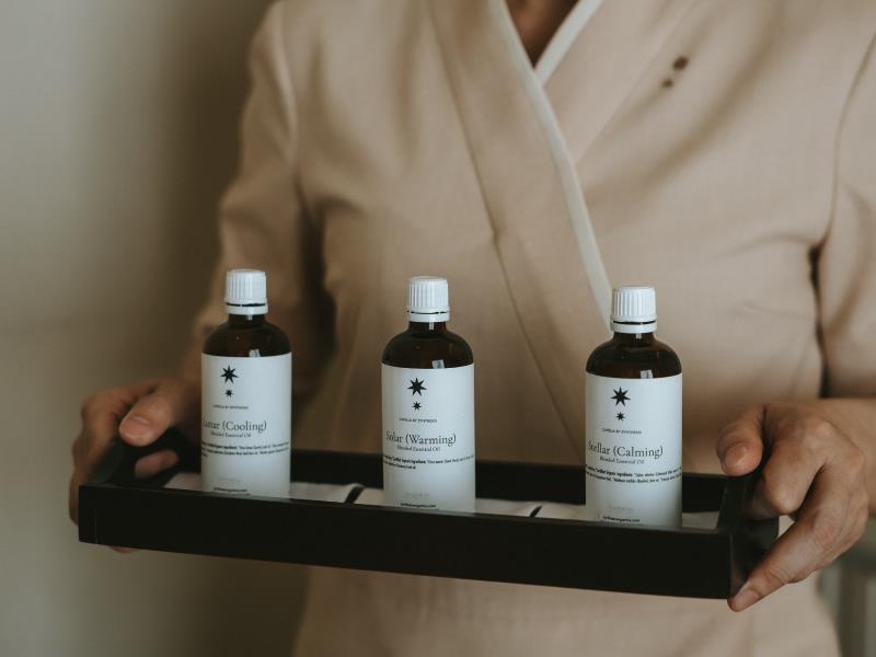 賓客抵達Capella Wellness後,將品啜依月相與療程選配的客製化中草藥迎賓茶,以千年智慧為底蘊,在漢方草本引導呼吸與味蕾的舒緩。 正式療程前,芳療師透過三款嘉佩樂複方精油的聞香體驗為起始,引導賓客依循直覺,從三款對應不同月亮能量頻率的礦石中擇一握於手中。