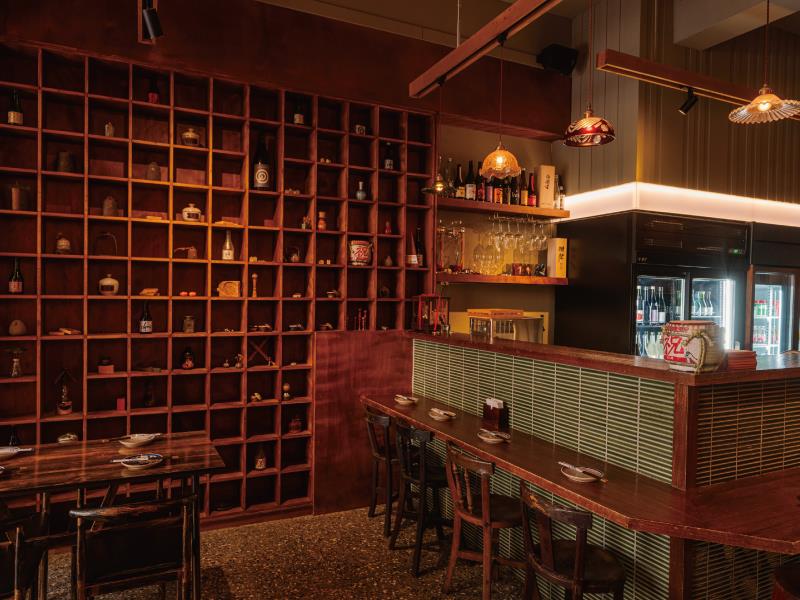 步入室內,暖黃燈光灑落在帶有紅色元素的皮質座椅,營造出既復古又自在的聚餐氛圍。不同於前兩間分店以豐富清酒藏品為核心,這裡的視覺焦點是吧檯區特別訂製的明亮方形展示冰箱。捨棄傳統葡萄酒吧橫躺在木架上的高冷設計,改以一目了然的陳列方式展現親和力,讓人能輕鬆挑選心儀酒款。