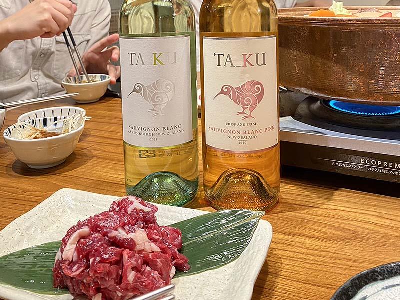 Ta Ku 在紐西蘭原住民毛利語就是「我的」意思。在去年與 Vincent 一起品飲時,他認為這款 Sauvignon Blanc 在入口前形成的嗅覺空檔,會就成高酸、輕酒體、芳香型的氣息;香氣上,不論是芭樂、芒果、鳳梨都是台灣人熟悉的美好滋味,因此適合搭配簡單食材原味、沒有過多濃烈氣味的食物,像是握壽司,入口後,Sauvignon Blanc 輕盈的酒體不會干擾「未經料理手法保護」的食材,不僅如此,若遇上油脂比較肥厚的鰭邊肉、鮪魚泥、海膽這類口感鮮嫩綿密的海鮮,Sauvignon Blanc 的高酸也能在口腔中平衡你腦中的罪惡感。而我個人認為,啜飲一口以蔬菜熬製的鮮甜湯頭,搭配 Ta_Ku Sauvignon Blanc 塔酷酒莊白蘇維濃白葡萄酒,正好可以打開味蕾,迎接接下來的溫體牛大軍。